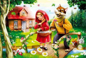 VLK: Jen pojď dál, děvenko a nestůj u dveří, s bábou jsem posnídal, ty zůstaň k večeři! Máš pěkné tvářičky, jak žádná druhá, zato tvá bába byla dost tuhá!!